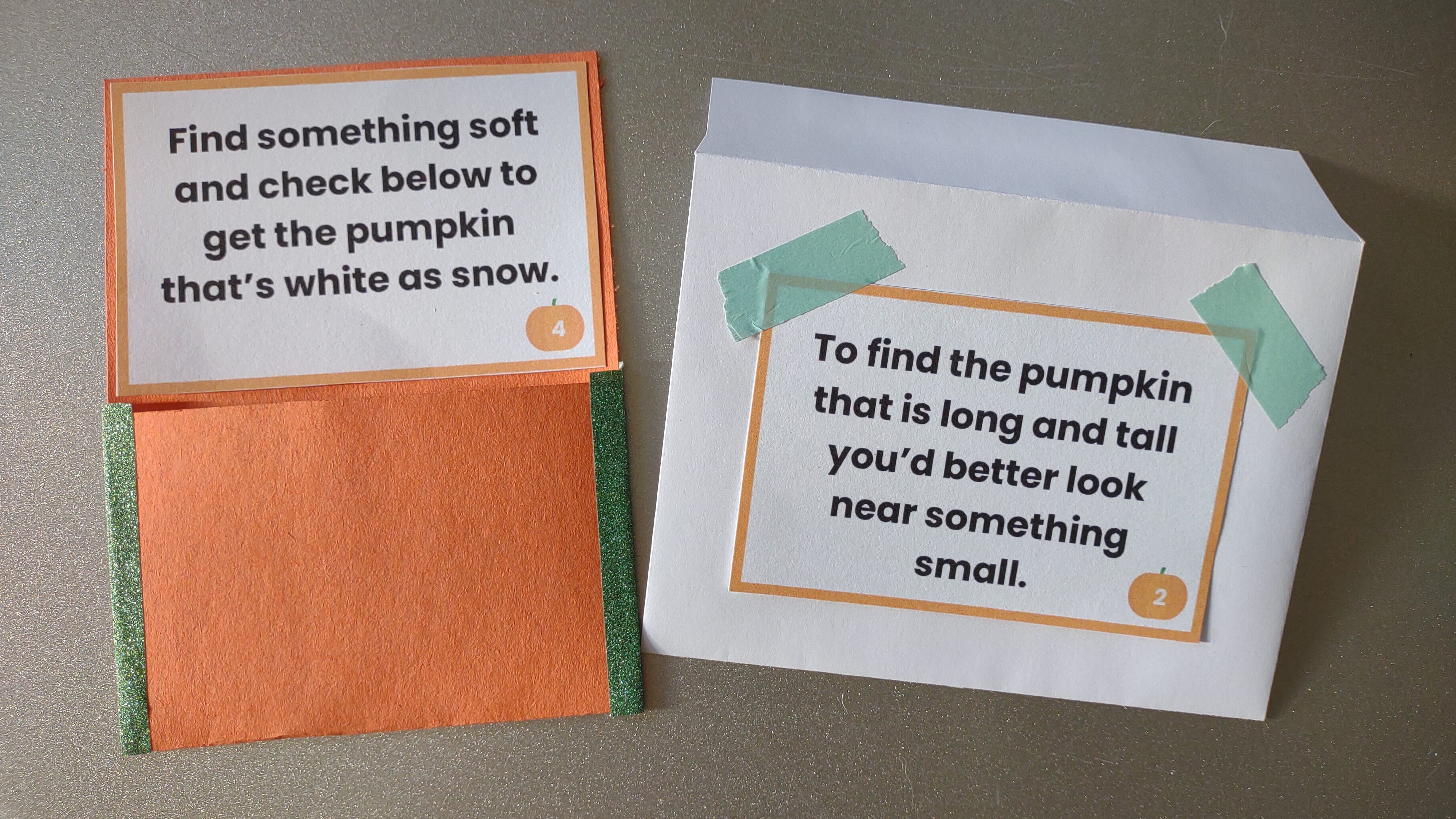 Place your pumpkins inside and that’s it! You can also just tape the clues to an envelope.